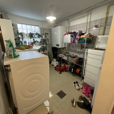 La réorganisation du rez-de-chaussée a également permis d’intégrer une buanderie fonctionnelle, discrète mais essentielle. Cet espace technique a été optimisé pour faciliter le quotidien, tout en s’intégrant harmonieusement au nouvel agencement.