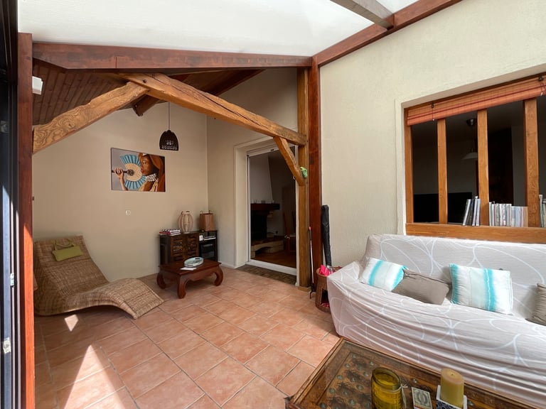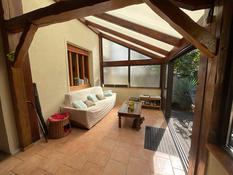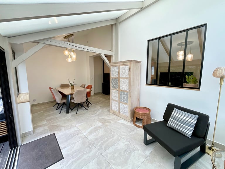 Les propriétaires ont également su faire preuve de goût dans la décoration, notamment dans la véranda repeinte dans des tons clairs, avec un mobilier soigneusement sélectionné pour créer une ambiance douce et chaleureuse.